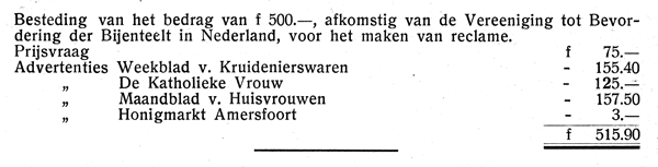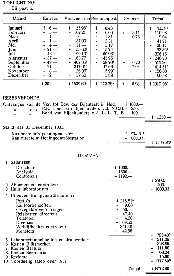 Door vrijwillige bijdragen der leden kon worden overgegaan tot vorming van een reservefonds. Hierin werd gestort door: de Vereeniging tot Bevordering der Bijenteelt in Nederland f 1.000,—. de R.K. Bond van Bijenhouders van den N.C.B, f 250.—, den Bond van Bijenhouders van den L.L.T.B. f 100,—. Totaal f 1.350,—. Deze gelden zijn belegd bij de rijkspostspaarbank.