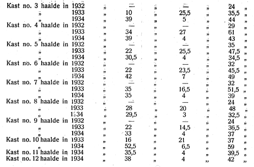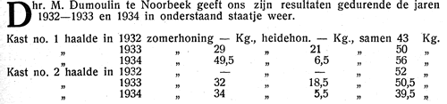Dhr. M. Dumoulin te Noorbeek geeft ons zijn resultaten gedurende de jaren 1932 – 1933 – 1934 in onderstaand staatje weer.