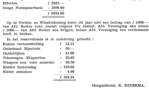 De Winstsaldo's van Afd. Handel, Suiker en Assurantie bedragen resp. f 487.86½, f 1752.92 en f 163.68, terwijl op Afd. Vereniging een nadelig saldo is van f 0.20½.