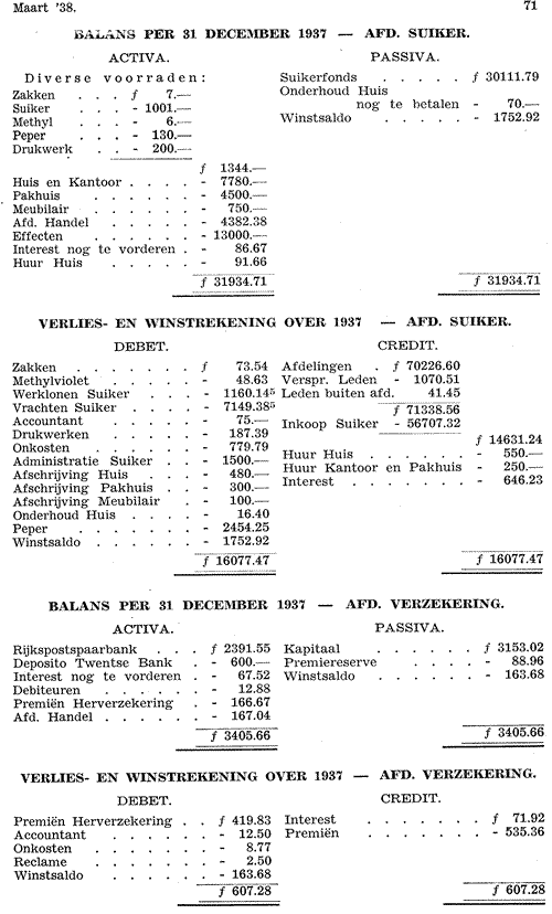 De winst van 1936 werd gevoegd bij het suikerfonds. De nog te betalen termijn van de verbouwingskosten ad f 70.- werd als schuld opgenomen. De afschrijvingen werden opgenomen in overeenstemming met het besluit van het hoofdbestuur.